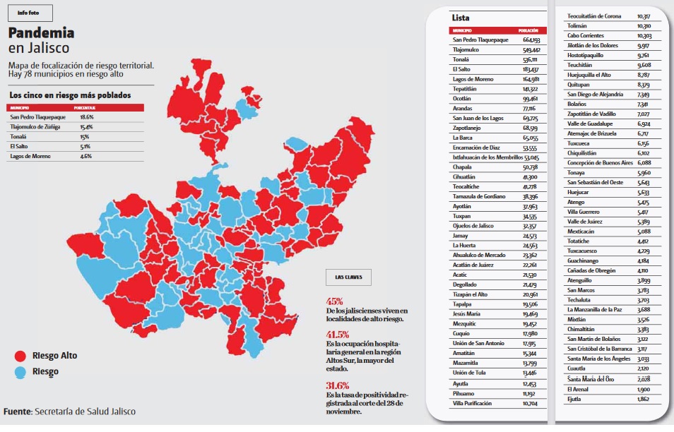 El total de los 78 municipios con el riesgo más alto suma 3 millones 558 mil 308 habitantes, lo que presenta 45.3 por ciento del total de personas que viven en Jalisco, que son 7 millones 844 mil 830, según el Inegi.