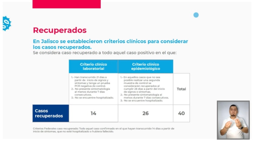 El secretario de Salud, Fernando Petersen informó que Jalisco reporta a 40 personas recuperadas de covid-19 aunque aún se les aplicará una segunda prueba PCR a 26 de ellas para reconfirmar que ya no cuenten con la enfermedad, esto debido a que en la entidad se optó por criterio más rígido para determinar si una persona esta recuperada o no.