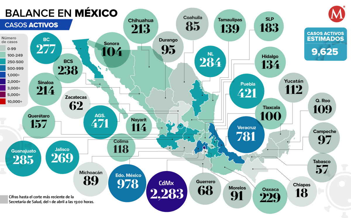 En Ciudad de México se estiman 2 mil 283 casos, Baja California Sur reporta 238, Baja California tiene 277 contagios, en Guanajuato 285 y Chihuahua registra 213.