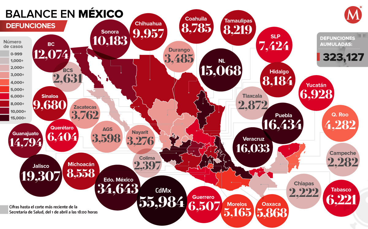 En Ciudad de México hay 55 mil 984 decesos acumulados, Estado de México confirma 34 mil 643, en Jalisco hay 19 mil 307, Puebla registra 16 mil 434 y Veracruz tiene 16 mil 33.