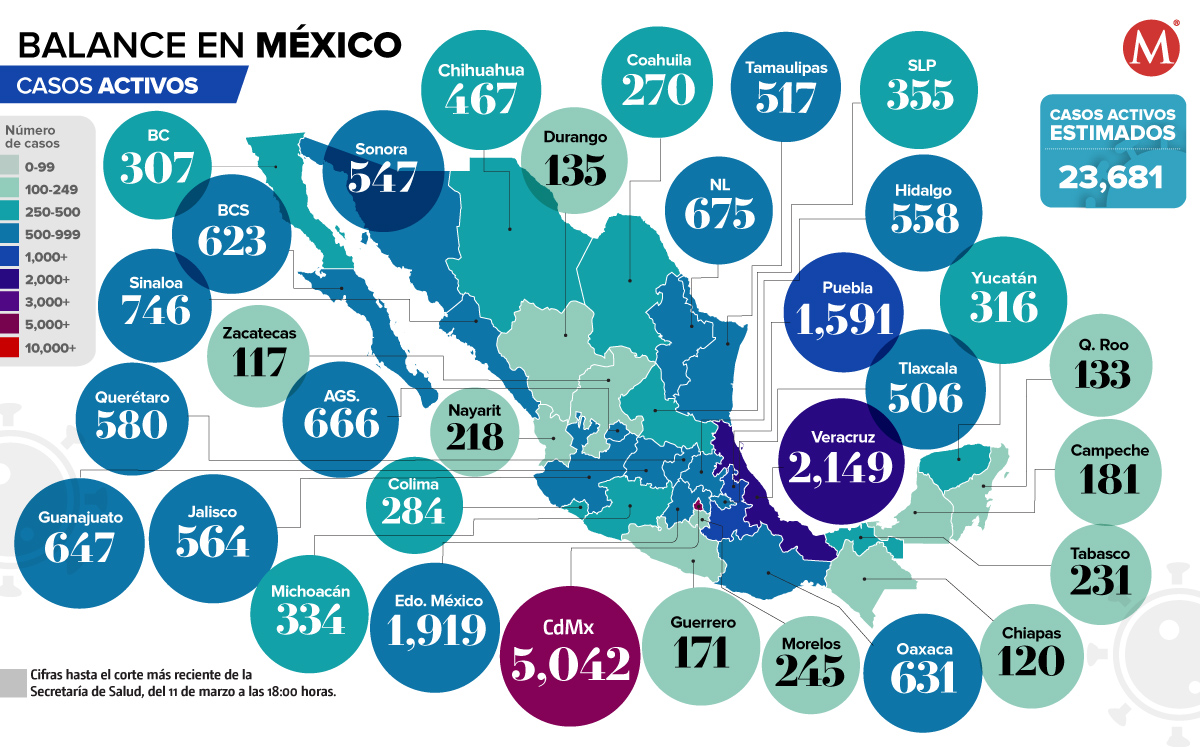 En Ciudad de México se estiman 5 mil 42 casos, Baja California Sur reporta 623, Baja California tiene 307 contagios, en Guanajuato 647 y Chihuahua registra 467.
