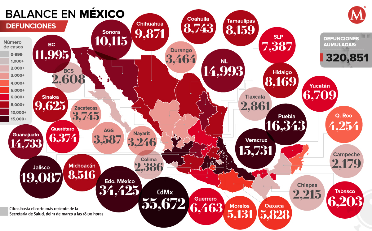 En Ciudad de México hay 55 mil 672 decesos acumulados, Estado de México confirma 34 mil 425, en Jalisco hay 19 mil 87, Puebla registra 16 mil 343 y Veracruz tiene 15 mil 731.