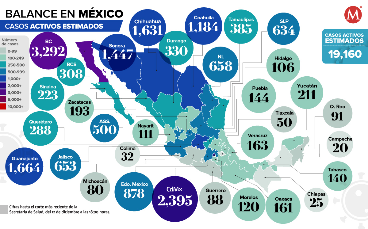 Hasta el corte de este domingo, hay 18 mil 212casos activos en la República. Baja California permanece como el estado con más casos activos, con 3 mil 292; posteriormente sigue la Ciudad de México con 2 mil 385, Chihuahua con mil 631, Guanajuato con mil 664 y Sonora con mil 447.