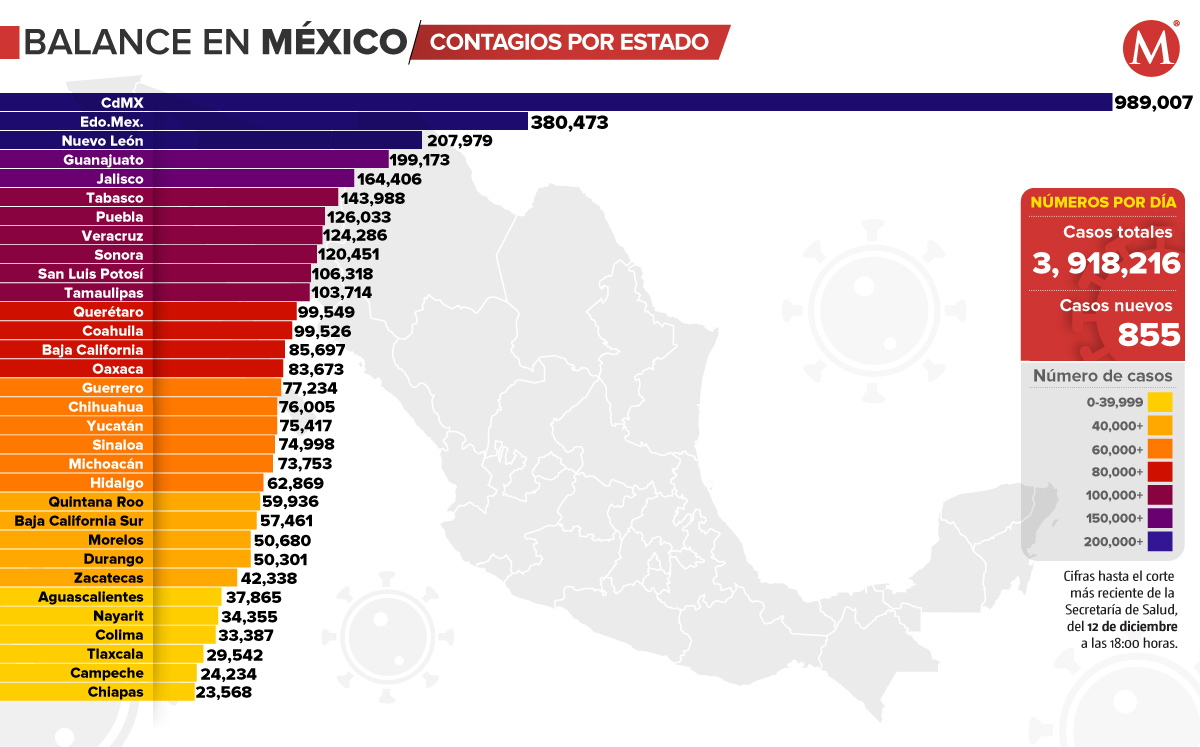 En las últimas 24 horas, México sumó 855 nuevos contagios de coronavirus, alcanzando un acumulado de 3 millones 918 mil 216, de acuerdo con lo informado por la Secretaría de Salud, en que también se añadieron 48 muertes para llegar al acumulado de 296 mil 672.