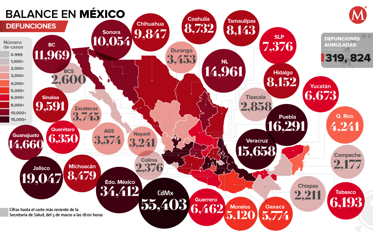 En Ciudad de México hay 55 mil 403 decesos acumulados, Estado de México confirma 34 mil 412, en Jalisco hay 19 mil 47, Puebla registra 16 mil 291 y Veracruz tiene 15 mil 658.