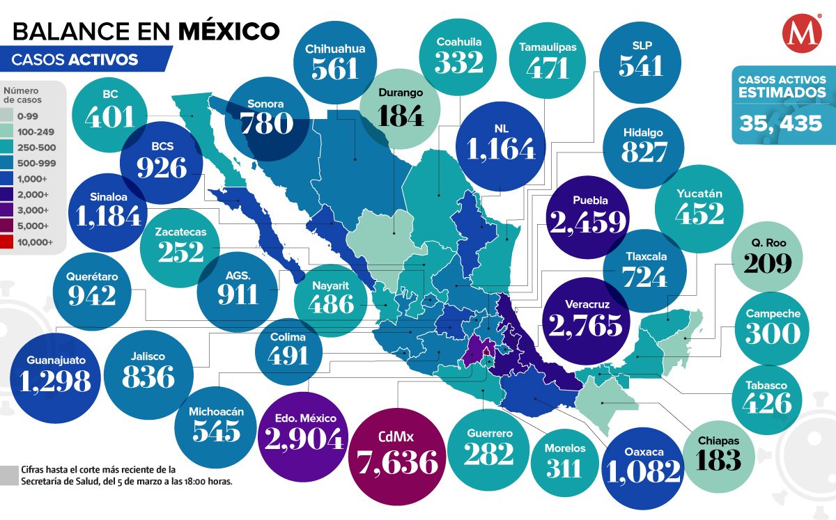En Ciudad de México se estiman 7 mil 638 casos, Baja California Sur reporta 926, Baja California tiene 401 contagios, en Guanajuato hay mil 298 y Chihuahua registra 561.