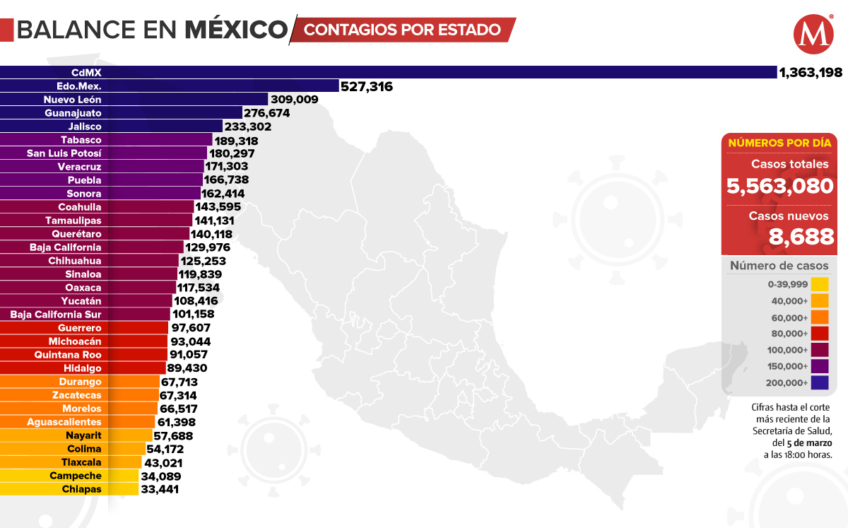De acuerdo con la Secretaría de Salud, en México hay un acumulado de 5 millones 563 mil 80 casos de coronavirus, sumando en las últimas 24 horas 8 mil 668 contagios.