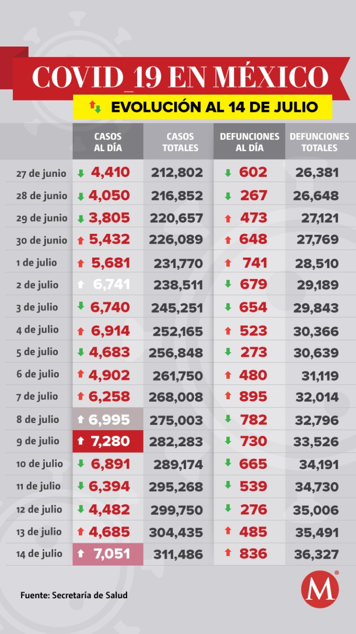 Este 14 de julio se reportaron 836 nuevas muertes y 7 mil 51 casos de covid-19 confirmados. Hay 2 mil 373 defunciones clasificadas como sospechosas.
