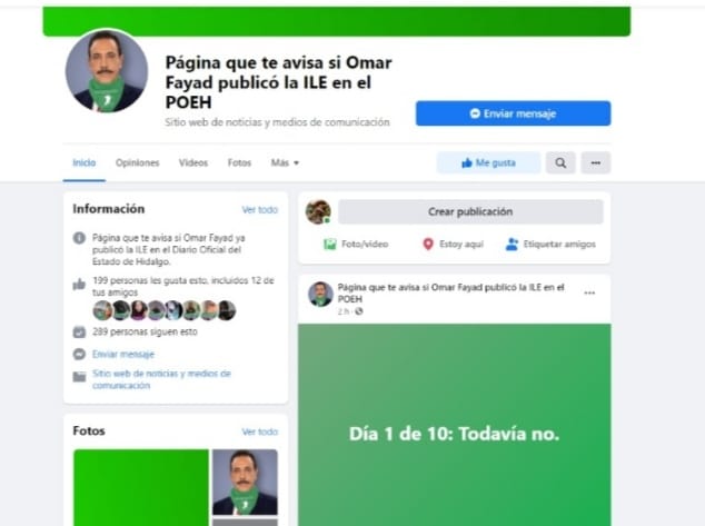 La página suma 330 seguidores, entre personas y activistas, y en la imagen de perfil fue colocada una fotografía del gobernador Omar Fayad Meneses a la que se le montó un pañuelo verde de la campaña nacional por el derecho al aborto legal, seguro y gratuito.