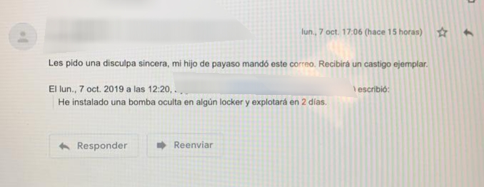 El alumno de un colegio en la alcaldía Cuajimalpa escribió un correo electrónico a autoridades de la institución y les dijo que había instalado una bomba en uno de los casilleros y que explotaría en dos días; pero se trató de una broma.
