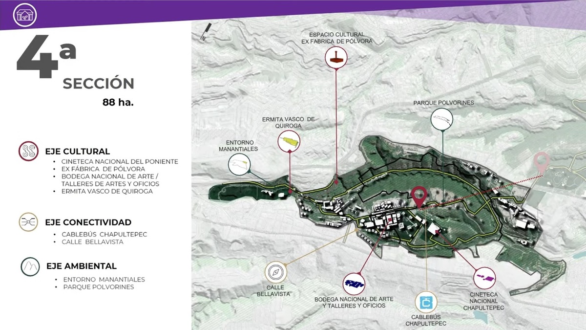 La cuarta sección del Bosque de Chapultepec contará con tres ejes. El primero, denominado Eje Cultural, el cual estará integrado por la Cineteca Nacional del Poniente, la Ex Fábrica de Pólvora, la Bodega Nacional de Arte /Talleres de Artes y Oficios, y la Avenida Vasco de Quiroga.