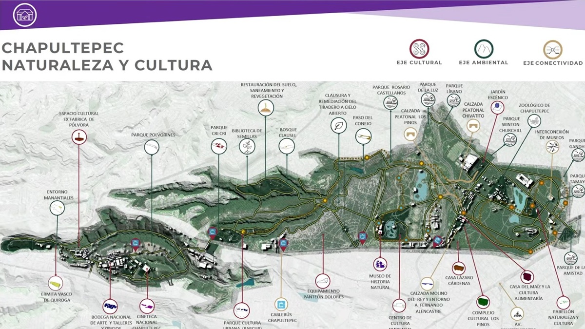 El Eje de Conectividad se integrará por el Cablebús Chapultepec y la Calle Bellavista, mientras que el Eje Ambiental será integrado por el Entorno de Manantiales y el Parque Polvorines.