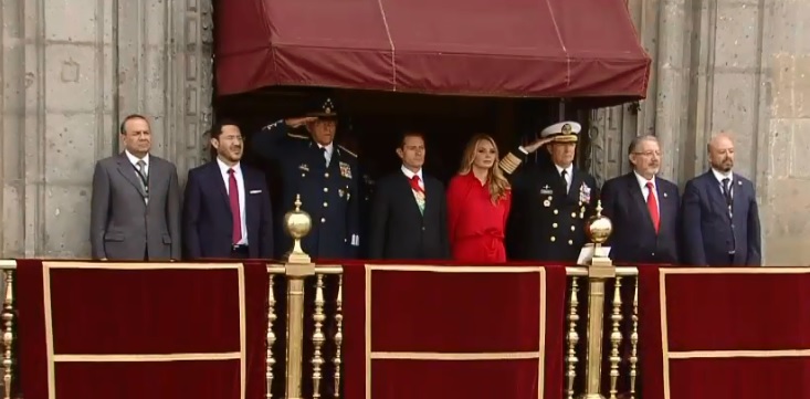 Solicitan permiso al presidente Enrique Peña Nieto para comenzar el desfile; el Presidente da la orden. La gente ocupa la plancha del Zócalo para presenciar la marcha de la fuerzas armadas.
