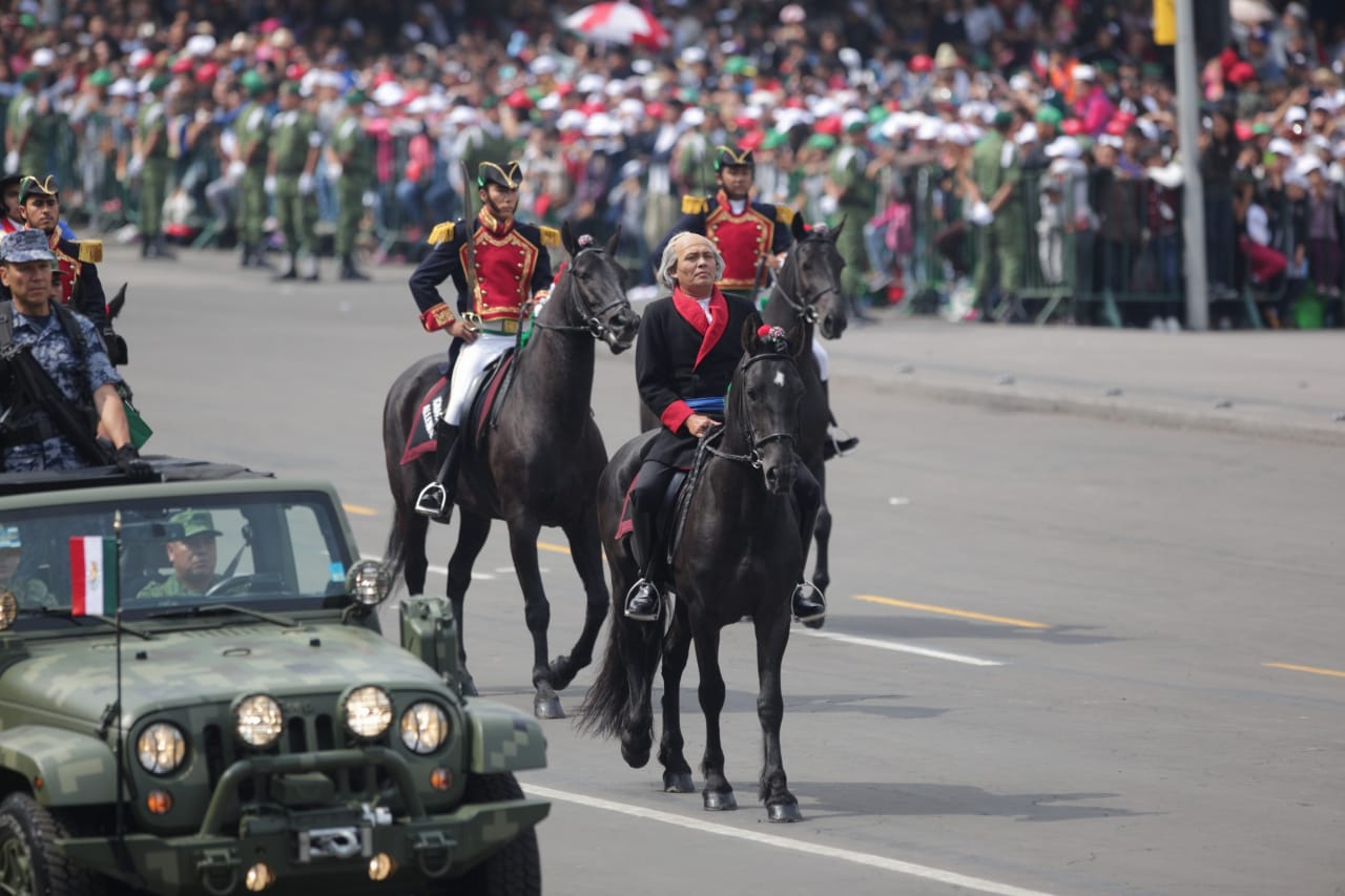 El agrupamiento montado cierra el desfile. Se da el informe; desfilaron: 123 banderas, 18 mil elementos de las fuerzas armadas, 30 saldados honorarios, 10 rescatistas, 20 niñas y niños, 401 vehículos, 177 aeronaves y 259 caballos. Sin novedad.