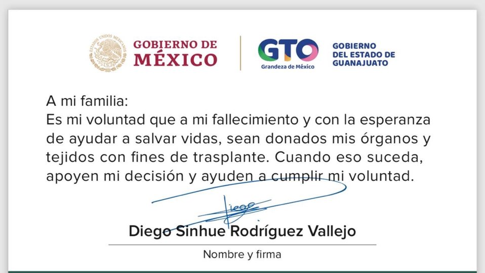 En la conmemoración del Día Nacional de Donación y Trasplante de Órganos y Tejidos, el pasado 26 de septiembre, Diego Sinuhe Rodríguez Vallejo, Gobernador de Guanajuato, firmó en un acto privado junto con su esposa el acta que lo acredita como donante oficial de órganos. Hecho histórico al ser el primer mandatario estatal guanajuatenses en hacerlo.