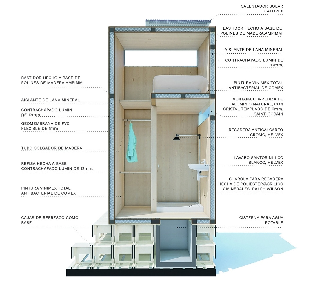 El Pabellón de Vivienda Temporal para Trabajadores Sanitarios del Hospital de la Cruz Roja en Ecatepec, brindará espacios seguros para el personal médico que atiende a los pacientes con covid-19. Consta de 12 módulos de 7 metros cuadrados cada uno, integrados por un dormitorio, ropero, regadera, lavamanos, sanitarios, calentador eléctrico, cisterna y ventilación natural.