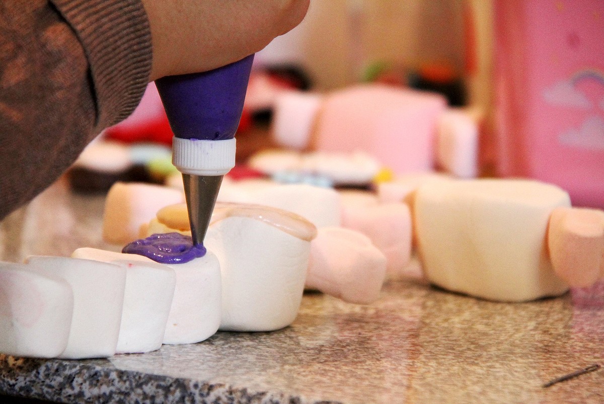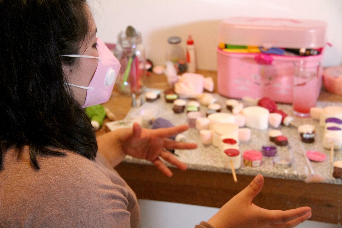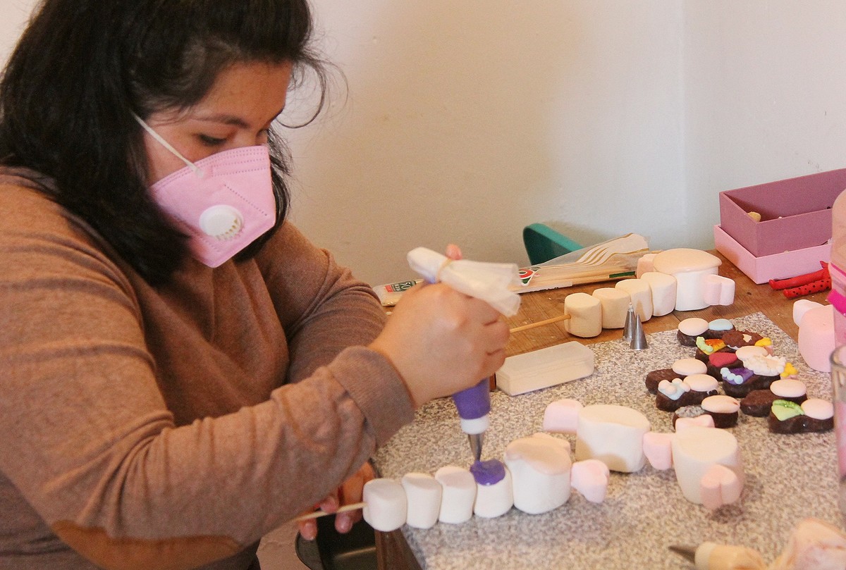 Acompañada de sus pequeños hijos, toma la silla en la que nacen sus creaciones, la acerca a la mesa donde ya tiene todo preparado; los bombones blancos y rosas sobresalen, también están las mangas o duyas llenas de una mezcla espesa, que es la que dará color a lo que posteriormente se convertirá en las figuras de José, María y el Niño Jesús.
