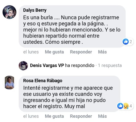 Una de las constantes más reiteradas fue que al registrarse no podían avanzar porque el sistema les decía usuario ya registrado, cuando no habían llenado el formulario; además señalan que no es posible que se haya agotado en las primeras horas porque no lo dieron a conocer y siendo domingo no tenían a la mano sus documentos escaneados.