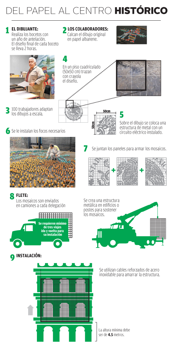 Medina Chirino es un empleado de la Agencia de Gestión Urbana (AGU) del Gobierno de Ciudad de México, en la que laboran 100 trabajadores, divididos en dos campos y dos turnos de trabajo cada uno. Una vez que Raúl Ademar tiene los diseños finales, algunos de sus colaboradores trazan sobre papel albanene el esbozo para comenzar después la adaptación de los dibujos a escala. Luego, una cuadrilla de 30 trabajadores distribuye con rapidez y casi por inercia, una serie de bombillas que terminan por conformar en gran formato los bosquejos que don Raúl comenzó a trazar hasta con un año de anticipación.