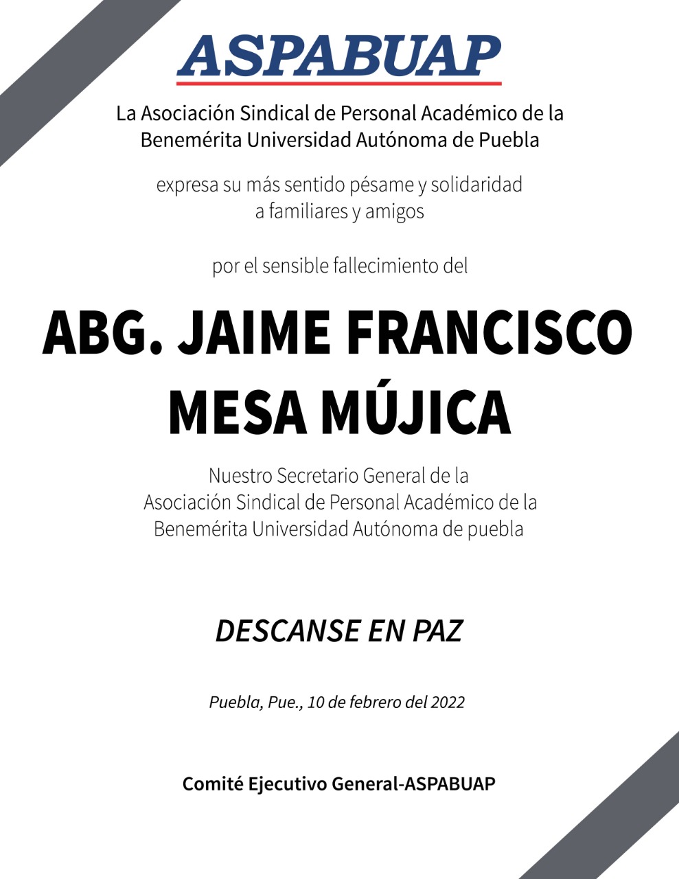 “La Aspabuap expresa su más sentido pésame a familiares y amigos por el sensible fallecimiento del abogado, Jaime Francisco Mesa Mújica, nuestro secretario general. Descanse en paz”, informó el gremio de docentes de la BUAP.