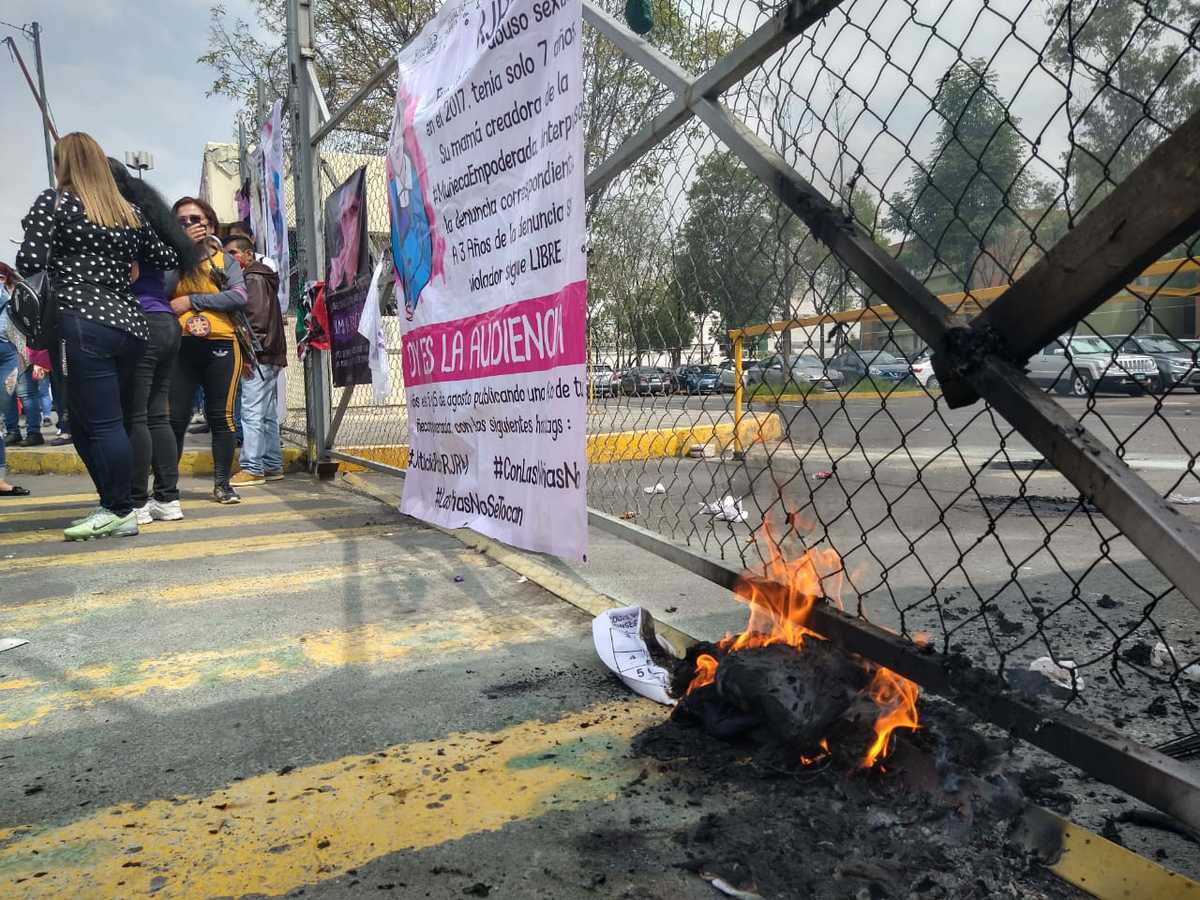 Integrantes del colectivo Ni una menos protestan afuera del reclusorio Oriente, frente a los juzgados de control, en la alcaldía Iztapalapa, Ciudad de México, en el marco de la audiencia de un hombre señalado de violar a una niña de siete años; acusaron que el presunto responsable lleva su proceso en libertad.