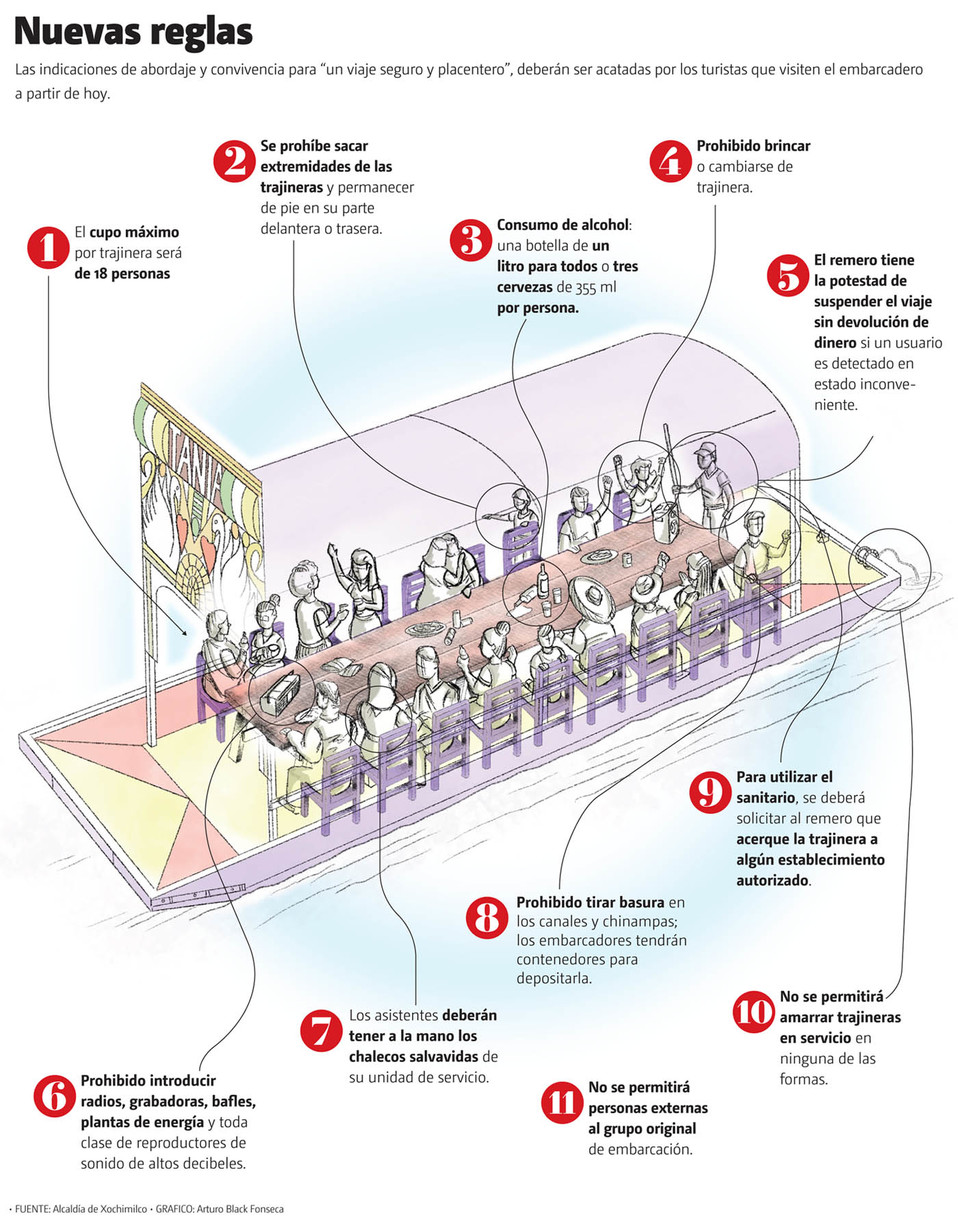 Las autoridades establecieron que en pro del medio ambiente y de la preservación de los canales “queda estrictamente prohibido tirar todo tipo de basura en los canales y chinampas; los residuos deberán ser depositados en los contenedores ubicados en los embarcaderos”.