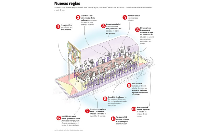 Entre otras restricciones que entran en vigor hoy, a las emblemáticas trajineras de Xochimilco solo podrán abordar como máximo 18 personas y de ninguna manera estará permitido que “personas ajenas al grupo inicial suban a la embarcación” durante el paseo por los canales.