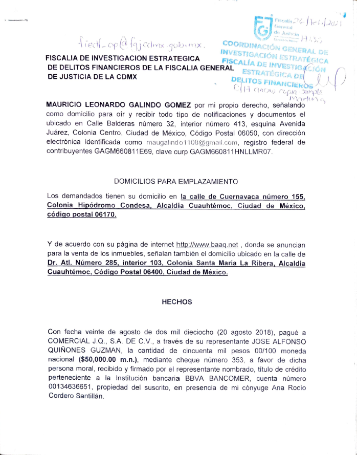 El 20 de agosto de 2018, Mauricio dio 50 mil pesos a la empresa BAAQ COMERCIAL JQ SA de CV, de José Alfonso Quiñones Guzmán y José Alfonso Quiñones Ríos, como anticipo para la compra de un departamento del edificio ubicado en el número 285 de la calle Dr. Atl, en la colonia Santa María la Ribera, cuya obra de reconstrucción y remodelación estuvo a cargo de la inmobiliaria.