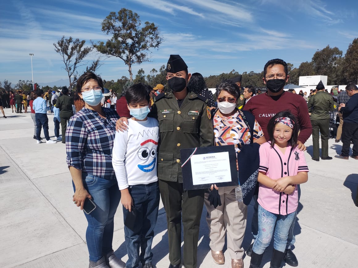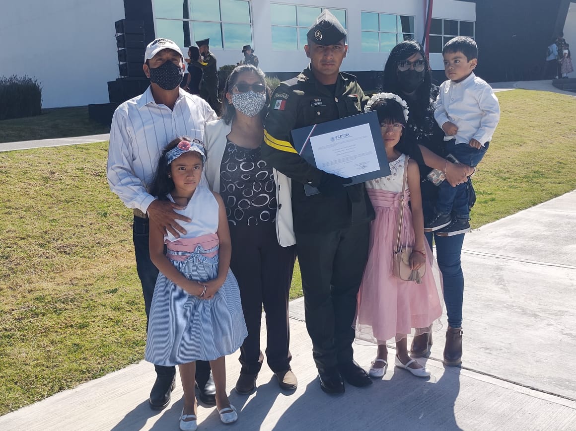 "Esto es una superación personal, el alejarnos de la familia es uno de los sacrificios que se hacen como militar, el alejarse de sus seres queridos. Pero se siente uno muy orgulloso de servir a la nación, ser mexicano y poder colaborar con nuestros compatriotas", refirió el ascendido a sargento segundo de la Policía Militar, Abraham Quiteiro Gutiérrez, poblano que en compañía de sus hijas, esposa y padres, recibió su respectivo título.