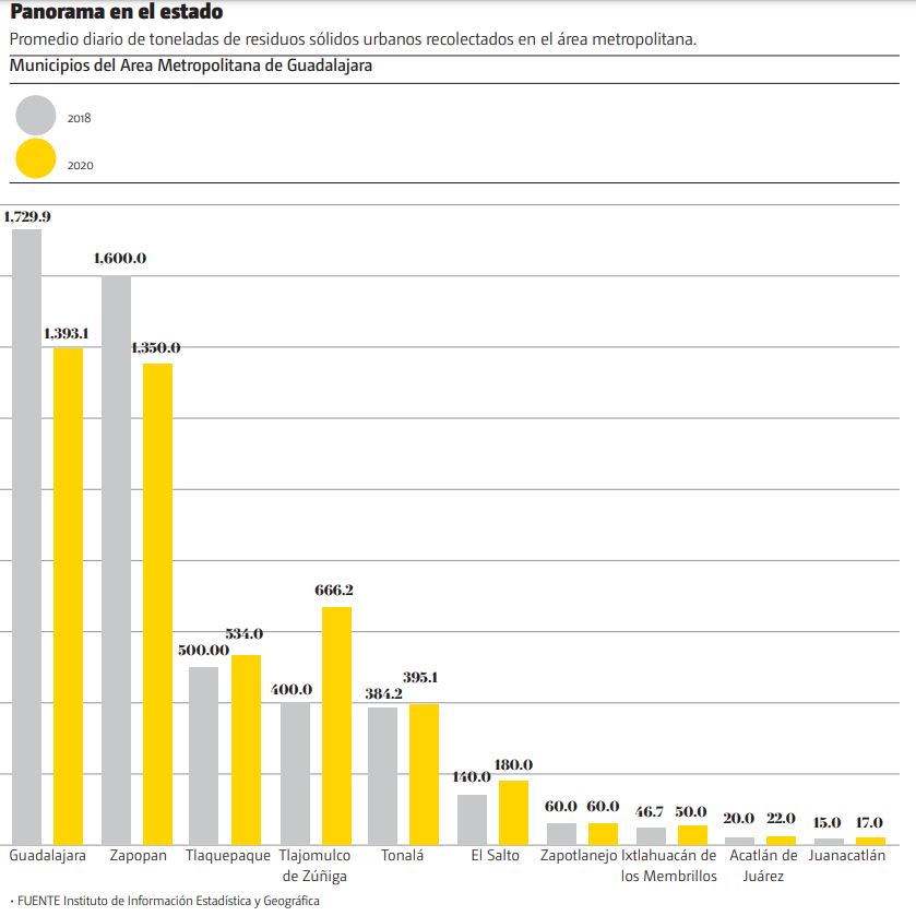 La mayoría de los residuos provenían de Guadalajara y Zapopan, los cuales también presentaron un decremento en 2020 con relación a 2018. En la capital jalisciense se recolectaron mil 393.1 toneladas diarias, cuando dos años antes fueron mil 729.9; y Zapopan pasó de mil 600 toneladas en 2018 a mil 350; Zapotlanejo se mantiene en 60 toneladas.