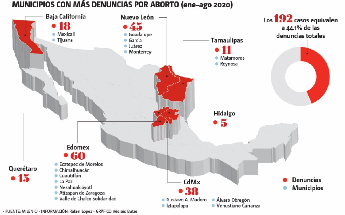 Las denuncias por aborto se hallan concentradas. La mitad de las 435 averiguaciones previas que recibieron las fiscalías estatales entre enero y agosto de 2020, se ubican en 30 municipios de nueve entidades.