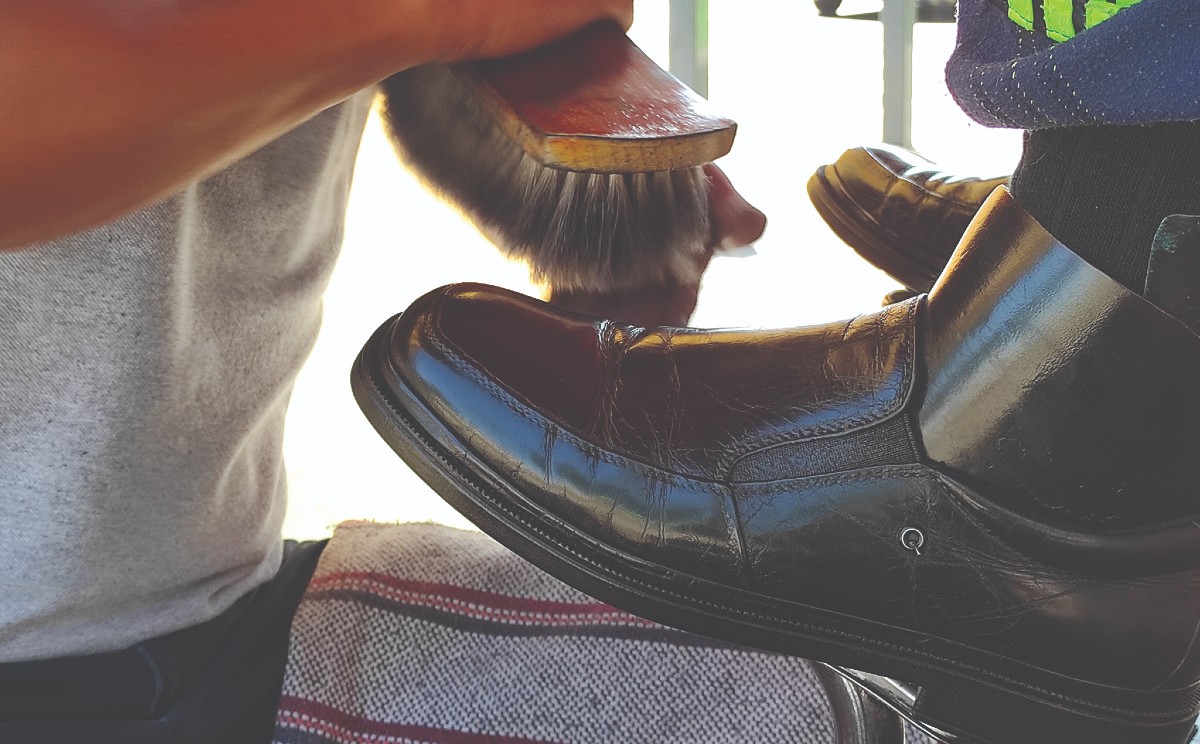 Sentado en su módulo, Apolonio tarde entre 10 y 15 minutos para dejar a un cliente satisfecho. Primero lava el calzado, lo limpia con gasolina o thinner, le coloca tinta y poco a poco le va sacando brillo con crema, cepillo y trapos.