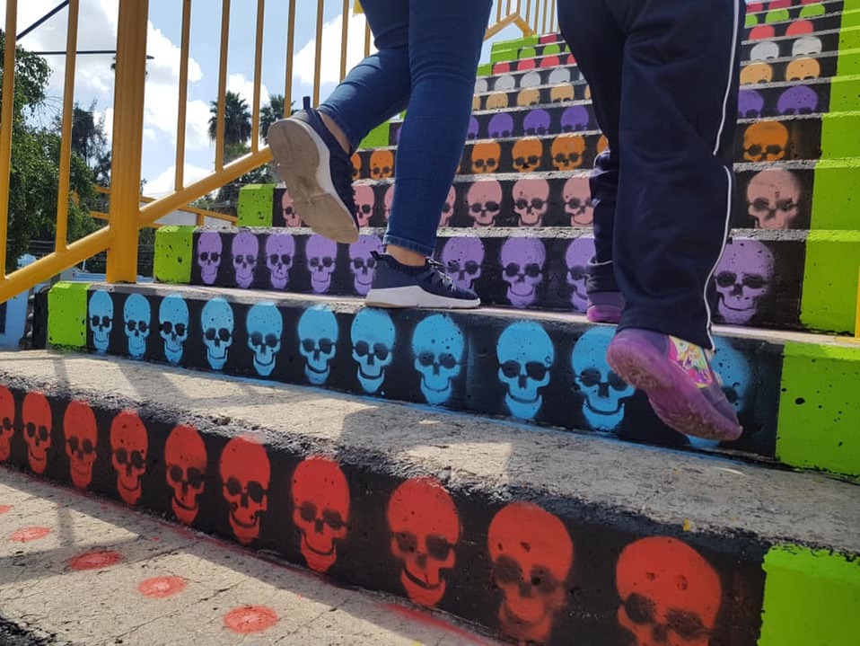 El Instituto de Municipal de la Juventud (IMJU) continúa dejando huella en la vida de los ciudadanos y ahora hasta les da color a sus pasos al llenar de arte las escaleras del puente peatonal que se ubica afuera del Panteón San Nicolás, esto como parte del Día de Muertos y la tercera edición del festival Mictlarte que se estará realizando el próximo 31 de octubre en el panteón Norte de municipio.