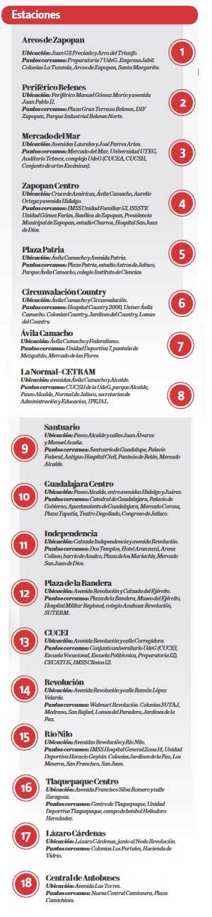 La obra pública que el entonces presidente de México, Enrique Peña Nieto, pregonó como uno de sus principales compromisos en materia de trenes pasajeros, tiene 18 estaciones, cinco en Zapopan, 10 en Guadalajara y tres en Tlaquepaque, va desde los Arcos de Zapopan hasta la Nueva Central Camionera.