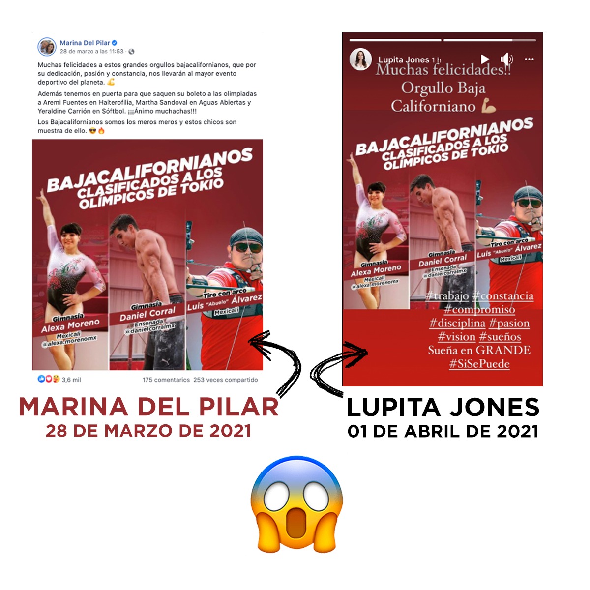 Lupita Jones, candidata de la coalición conformada por PRI, PAN y PRD a la gubernatura de Baja California, usó en su cuenta de Facebook un diseño que días antes publicó en la misma red social Marina del Pilar, abanderada de Morena, el PT y el Partido Verde, para felicitar a deportistas bajacalifornianos.