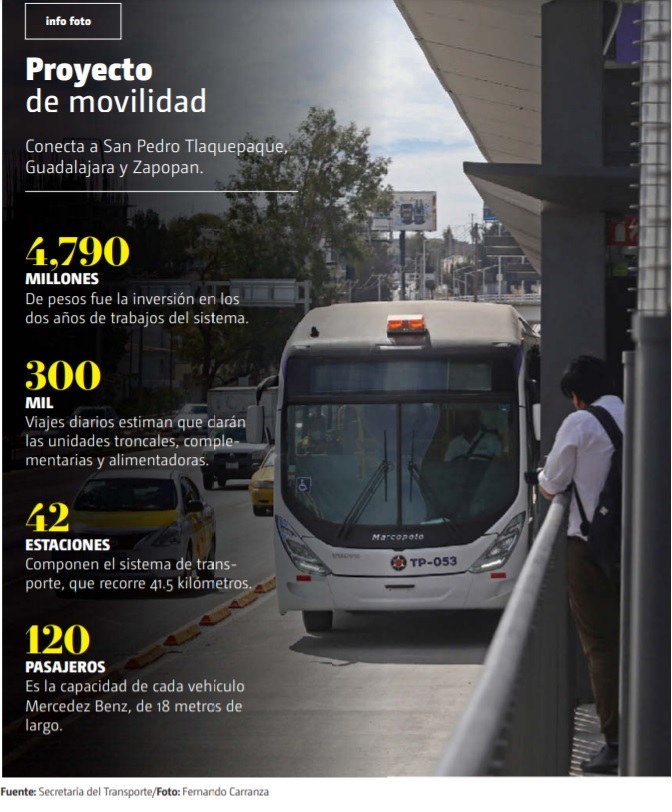 Este domingo comenzará a operar Mi Macro Periférico, que recorrerá 41.5 kilómetros en 42 estaciones, con un tiempo de una hora y 23 minutos, lo que lo convierte en el sistema de transporte público más grande del país, al atravesar los municipios de Guadalajara, Zapopan y San Pedro Tlaquepaque, con rutas alimentadoras y complementarias a Tonalá y Tlajomulco de Zúñiga. Diariamente tendrá la capacidad de trasladar a más de 400 mil personas.
