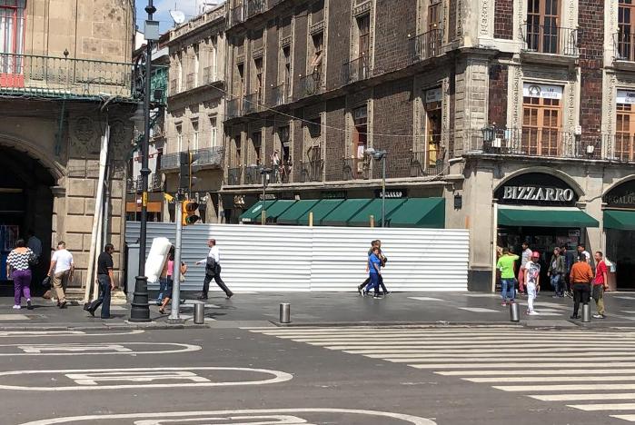 Para proteger negocios y monumentos, trabajadores del gobierno de la Ciudad de México colocación de vallas sobre la calle 5 de Mayo y alrededor de la Plaza de la Constitución.