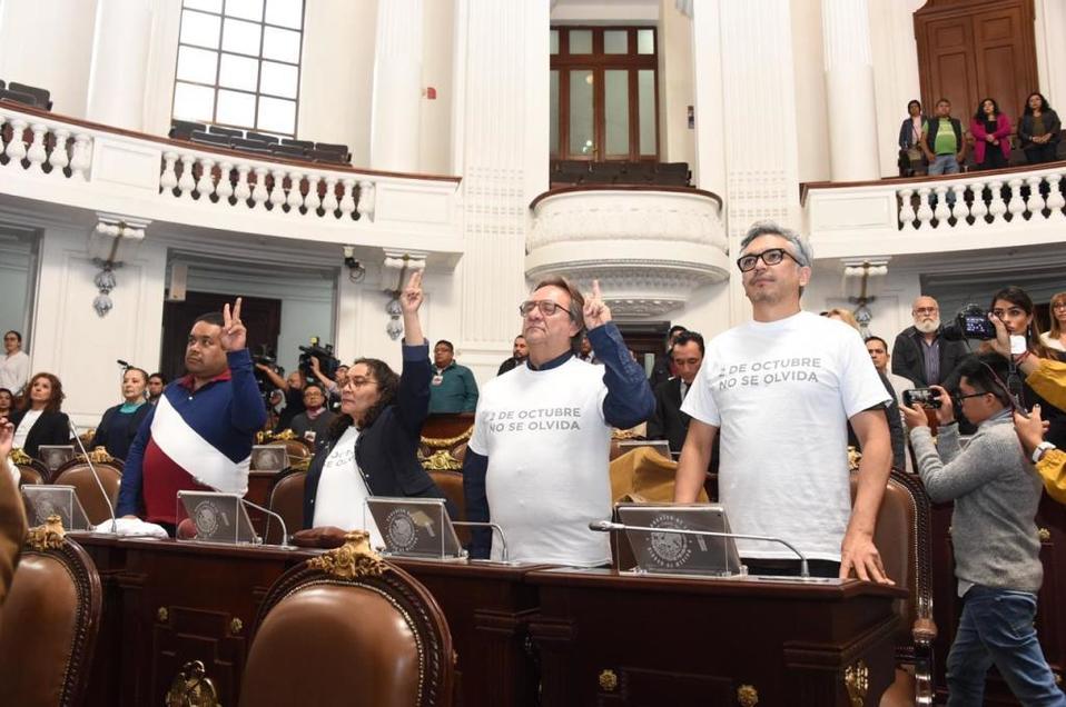 Con 40 diputados capitalinos, el Congreso de la Ciudad de México inició la sesión solemne, con motivo de la conmemoración de la matanza de 1968. Legisladores de Morena visten playeras blancas con el mensaje "2 de octubre no se olvida"