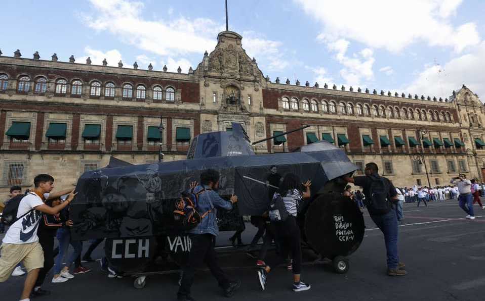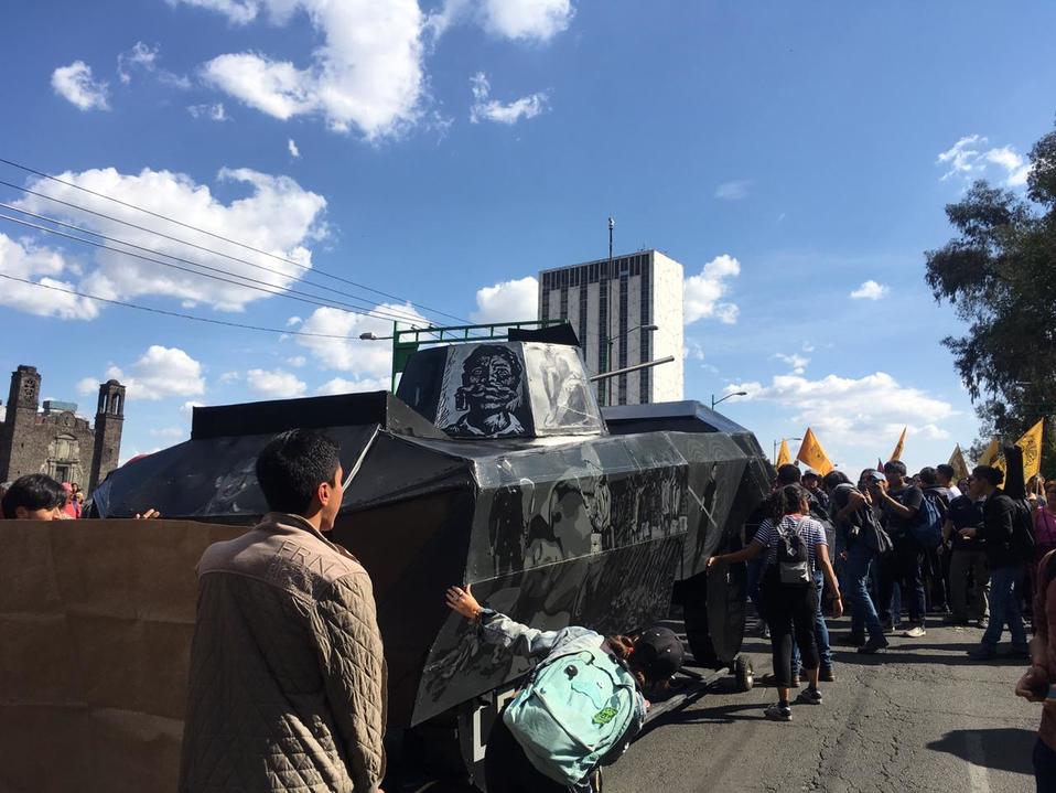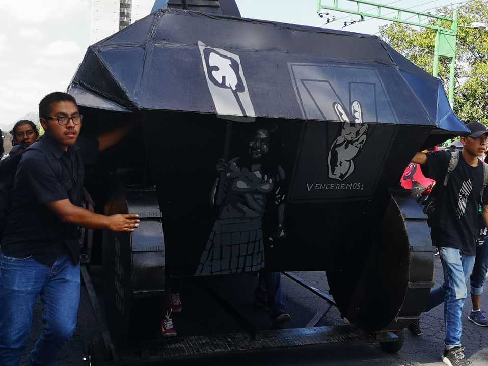 Alumnos del #CCHVallejo avanzan con un tanque de cartón hacia el Zócalo de la #CdMx durante la marcha del #2DeOctubreNoSeOlvida