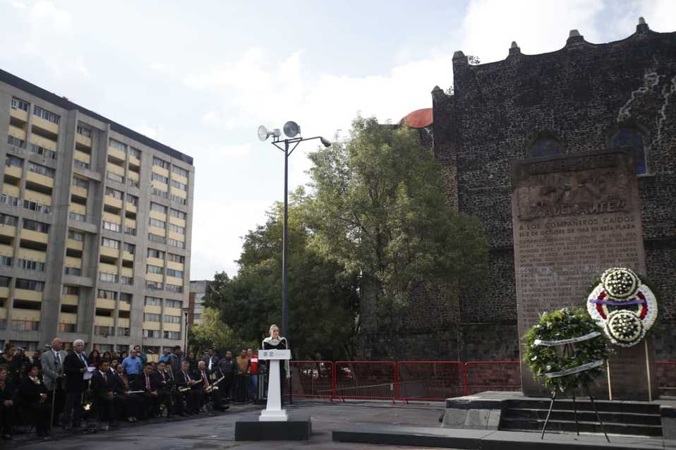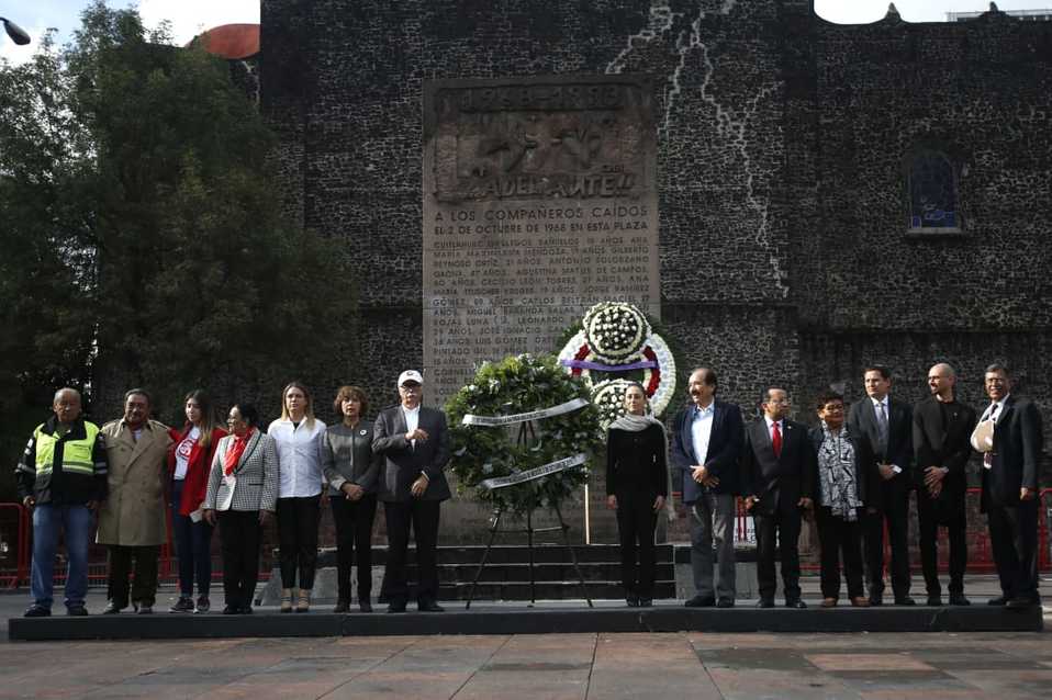 La jefa de Gobierno realizó un minuto de silencio durante la ceremonia conmemorativa en la Plaza de las Tres Culturas, por las víctimas de la matanza de estudiantes en 1968.
