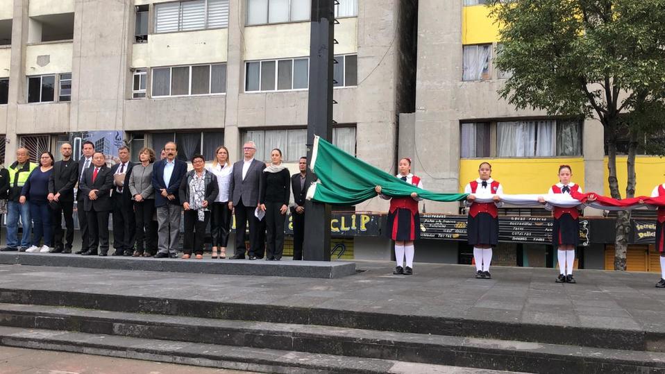 La jefa de Gobierno, Claudia Sheinbaum, encabeza una ceremonia conmemorativa del 2 de octubre de 1968, en la Plaza de las Tres Culturas, donde se alzó la bandera a media asta.