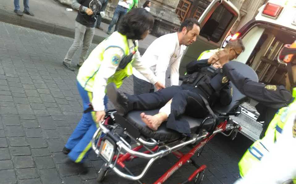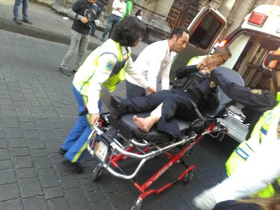 Una policía es atendida por paramédicos luego de que fue lesionada por un petardo lanzado entre Tacuba y Palma.