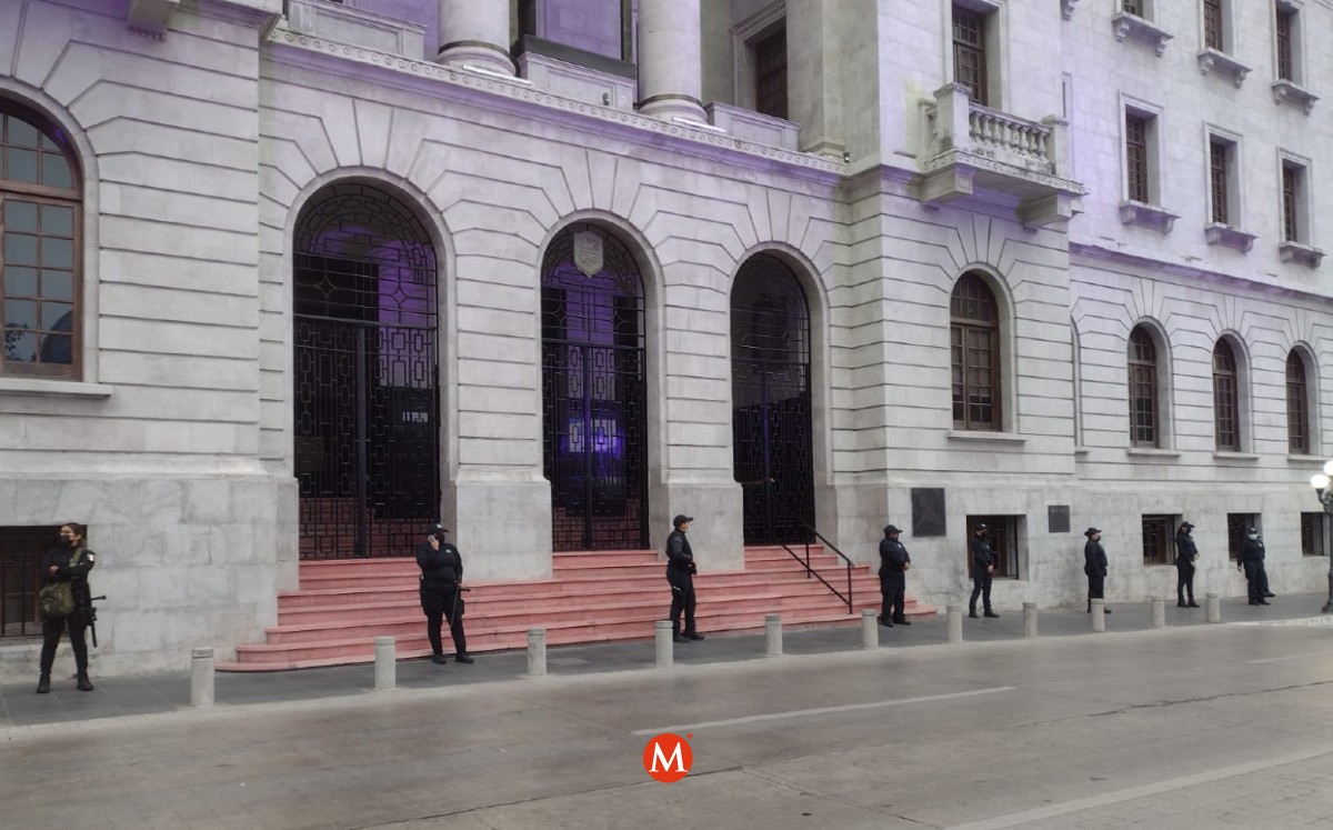Elementos de la Policía Estatal de Tamaulipas resguardan el edificio de la Presidencia Municipal de Tampico, el cual se ubica frente a la Plaza de Armas, sitio en donde terminará la marcha de los colectivos en este Día Internacional de la Mujer
