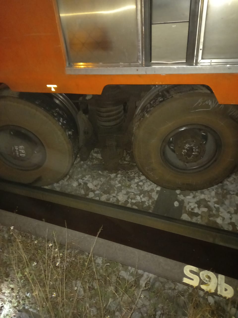 Se trata del convoy 3646, que al no alinearse con las guías, perdió dirección provocando que descarrilará sin provocar un daño mayor, por lo que se realizan las labores para colocarlo en su riel.