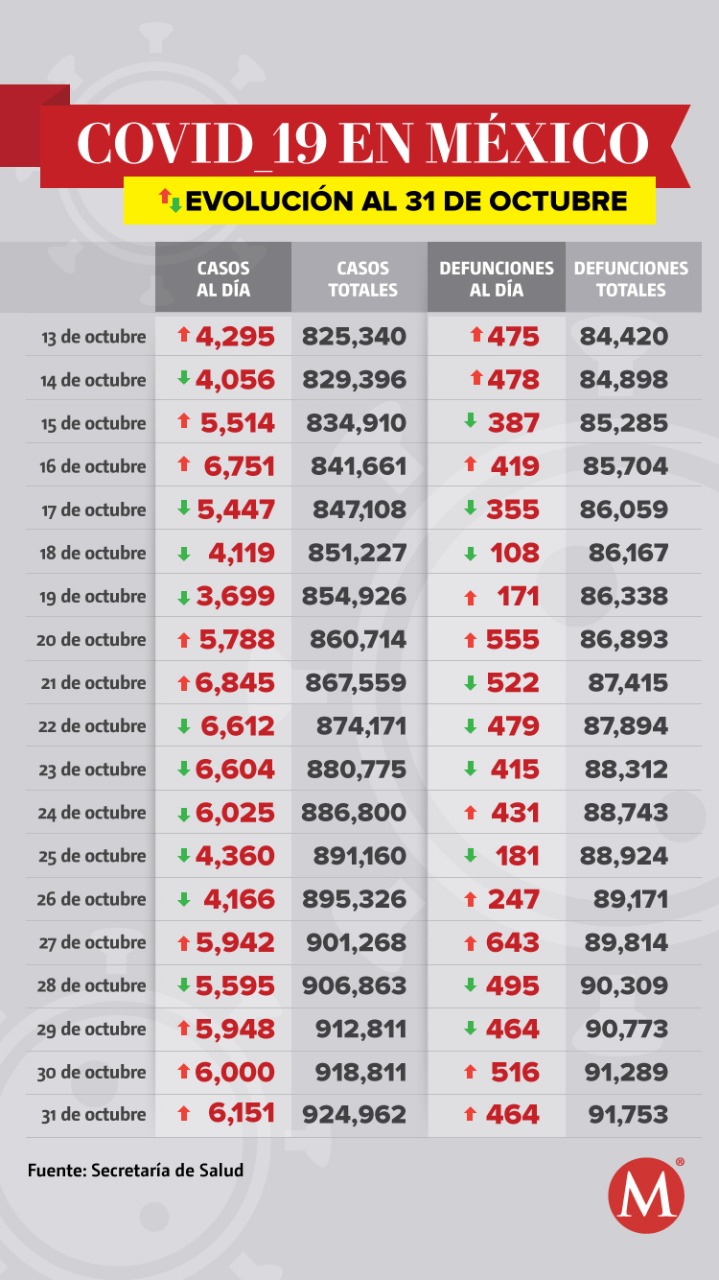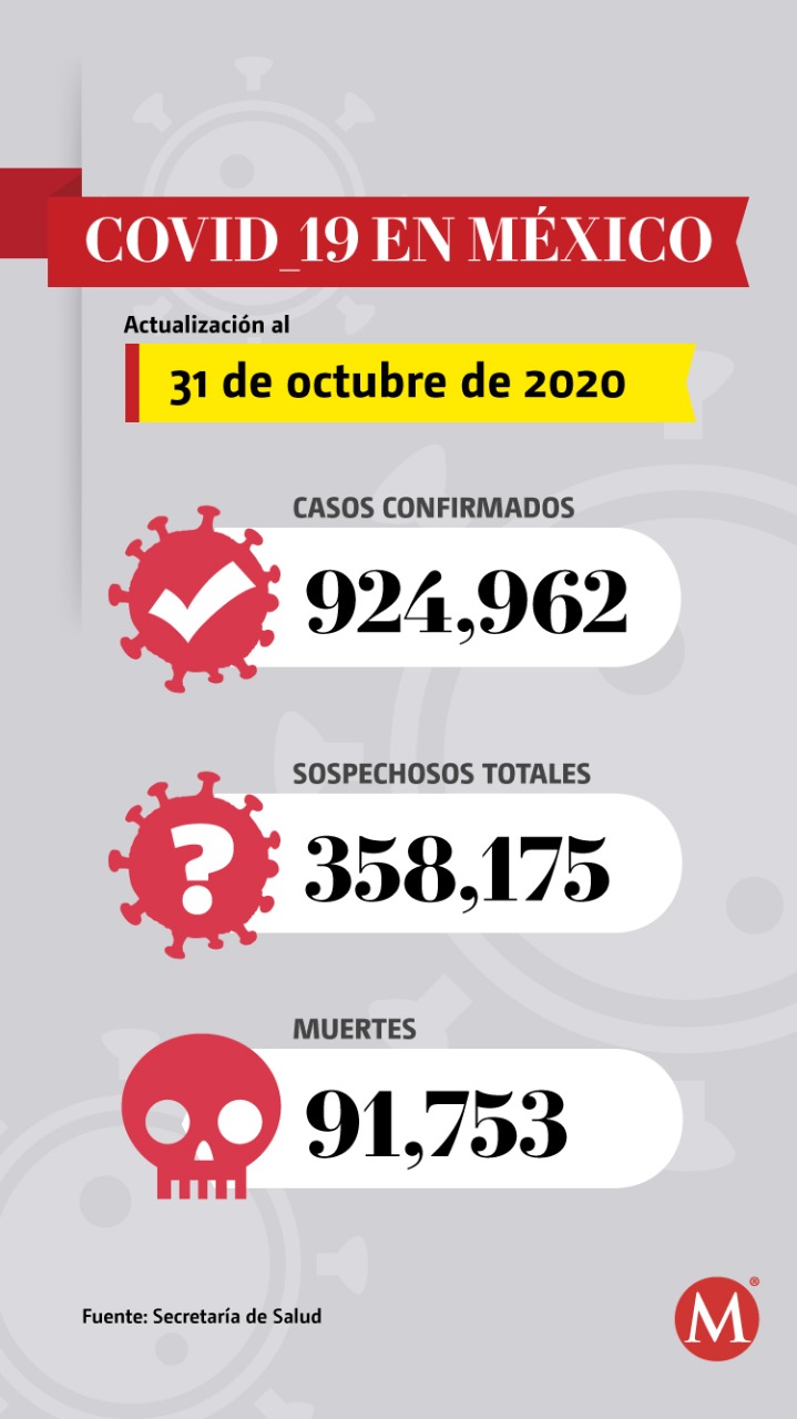 La Secretaría de Salud reportó este sábado la cifra de casos confirmados y decesos por covid-19 en el país. El informe confirmó que en México hay 924 mil 962 casos, lo que representa un incremento de 6 mil 151 contagios en la últimas 24 horas.