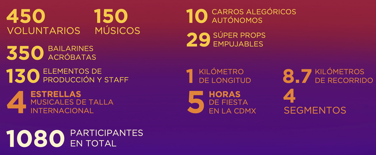 El desfile de este año, que se llevará a cabo el 31 de octubre a las 12:00 horas, recorrerá 8.7 kilómetros desde el Zócalo hasta Campo Marte, con más de mil voluntarios y música en vivo. Además, estará dividido en cuatro conceptos: Tenochtitlán, Ciudad de México hoy, Magia y Tradición, y Celebrando la Vida.