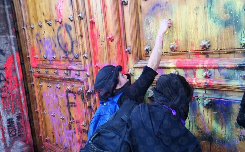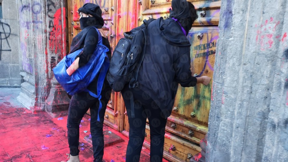 Encapuchadas vandalizan puerta 1 de Palacio Nacional