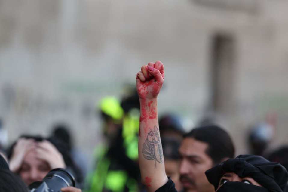 Un grupo de mujeres arrojaron pintura en aerosol al subsecretario de Gobierno de la Ciudad de México, Arturo Medina, cuando observaba la protesta en Palacio Nacional.