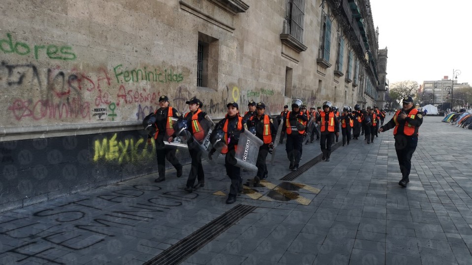 Mujeres policías de la Secretaría de Seguridad Ciudadana (SSC) realizaron una valla humana alrededor del recinto, para evitar que las manifestantes continúen haciendo pintas.