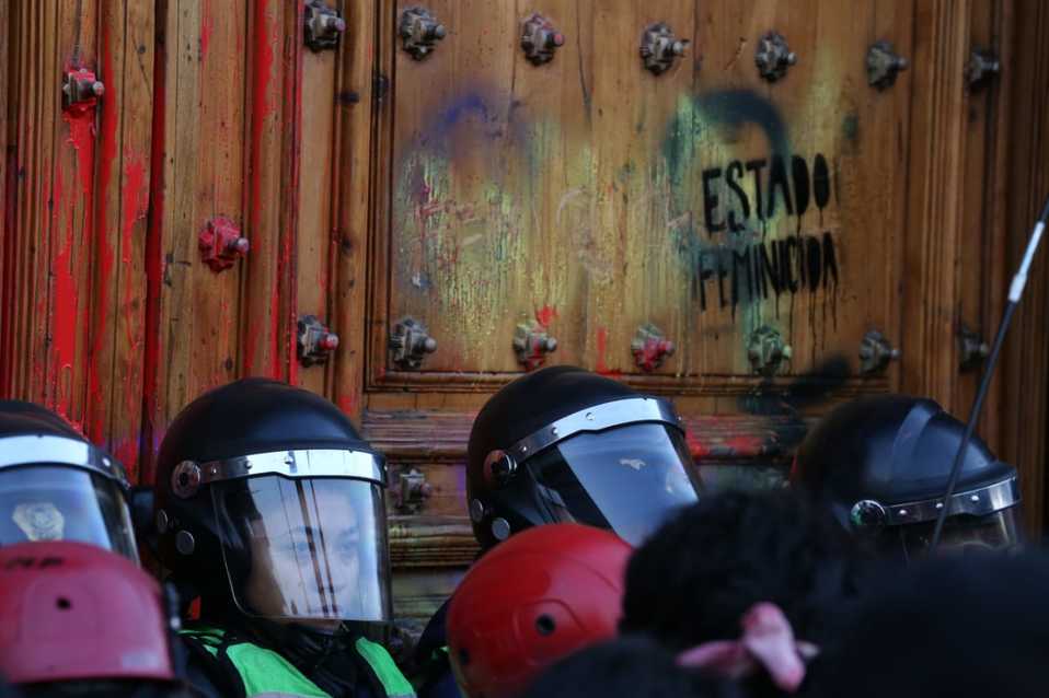 Un grupo de manifestantes realizó pintas en la puerta 1 del recinto, ubicada en la calle Moneda, donde también intentaron romper una ventana, para exigir ser atendidas por el presidente López Obrador.